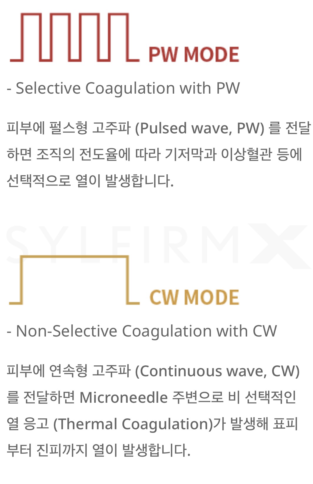 • Continuous Wave (CW): 에너지를 연속적으로 전달해 진피층의 콜라겐 재생을 유도합니다. 모공 축소와 주름 개선, 피부 탄력을 높이는 데 도움을 줍니다. ✨