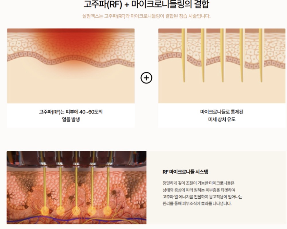 실펌엑스는 고주파(RF) 에너지를 미세한 바늘을 통해 피부 속 깊숙이 전달하는 시스템입니다. 단순한 자극을 넘어 피부 환경 자체를 건강하게 되돌려주는 역할을 하죠.