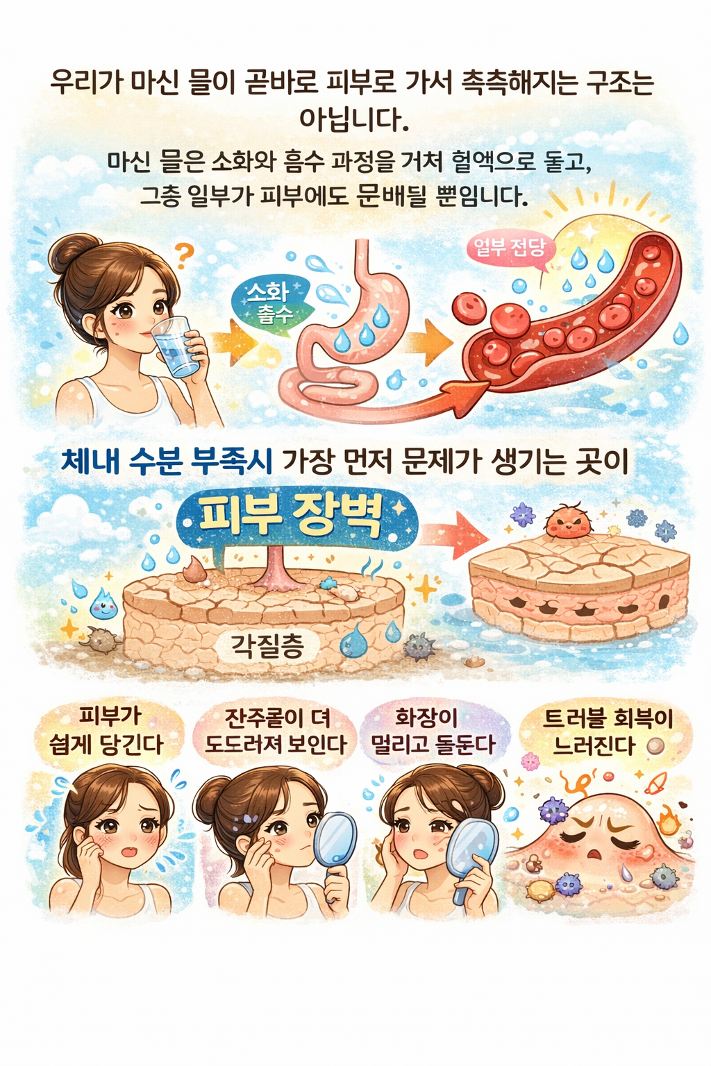 우리가 마신 물이 곧바로 피부로 가서 촉촉해지는 구조는 아닙니다. 마신 물은 소화와 흡수 과정을 거쳐 혈액으로 돌고, 그중 일부가 피부에도 분배될 뿐입니다.