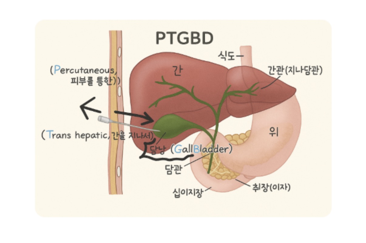 ✅ PTGBD는 염증이 심한 담낭에서 고름(Pus)을 빼주는 시술입니다.